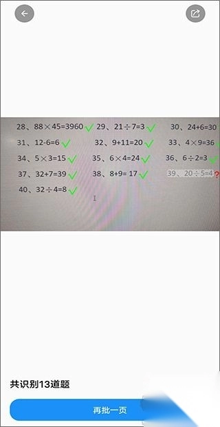 3、最后等待系统数秒,即可快速高效的批改孩子的口算作业,识别正确率也是非常高的,如果有多页也可以直接点击“再批一页”进行拍照。