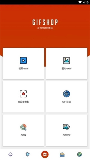 1. 当您进入软件首页时,能够看到6大功能,分别为视频转GIF、图片转GIF、GIF拍摄、屏幕录像机、GIF库以及GIF研究。