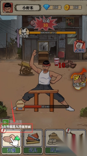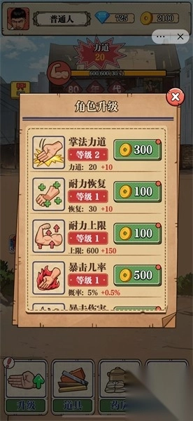 3、轻点升级按钮,耗费金币来强化角色的武术能力。