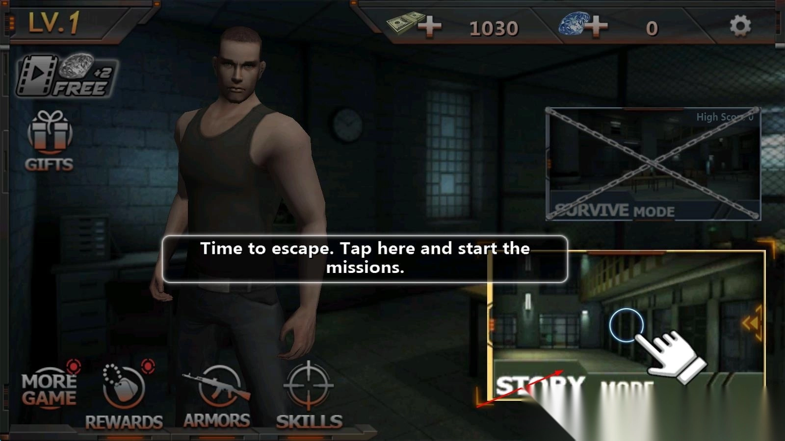 1、初入游戏,在死囚牢房中观察环境,收集隐藏工具,与相邻狱友建立信任,开启第一步逃生计划。