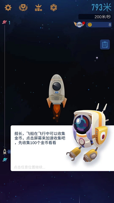星际探险家仅需简单的点击操作,玩家即可轻松上手。只要持续点击屏幕中的飞船,它就能不断飞行,无需复杂操作与策略。