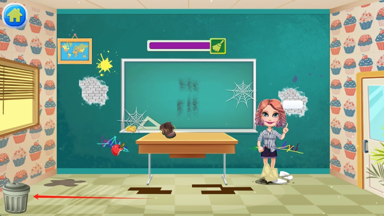 2、进入教室清洁场景,根据箭头提示,清理教室垃圾,保持教室整洁,点击扔垃圾。