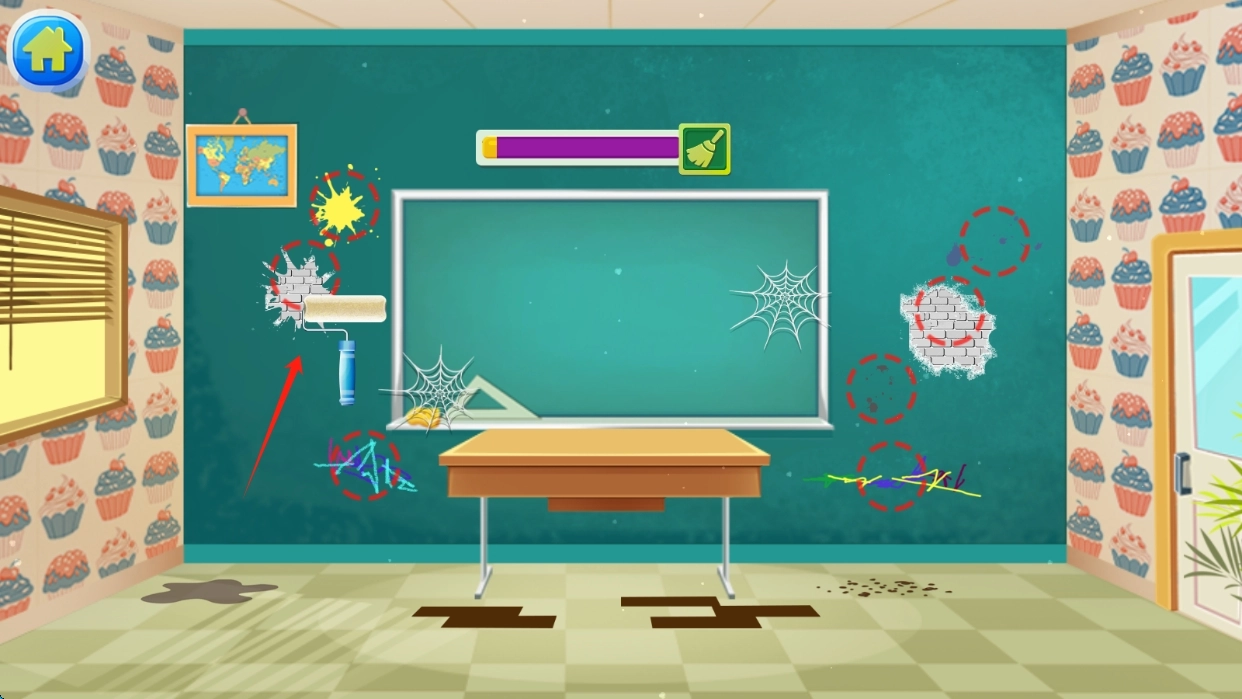 3、在后续教室清洁场景中,继续根据箭头提示,使用清洁工具,修复教室损坏部分,点击清理。