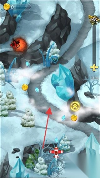 2、飞行场景,操控红色飞机在冰雪地形飞行,收集金币、躲避障碍(如火焰),沿路线前进,体现飞行冒险玩法,考验操作与反应。