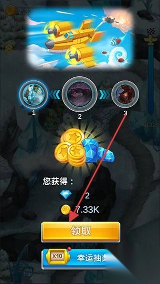 3、奖励界面,完成关卡后获得金币(7.33K)、钻石(2),点击“领取”获取奖励,还有“幸运抽奖”功能,用于强化飞机、推进游戏进度,展现养成与奖励机制。