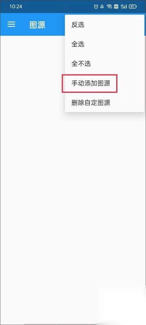 3、进入后能看到所有已安装的图源,接着点击右上角的“三个点”图标,在弹出的选项中选择“手动添加图源”。