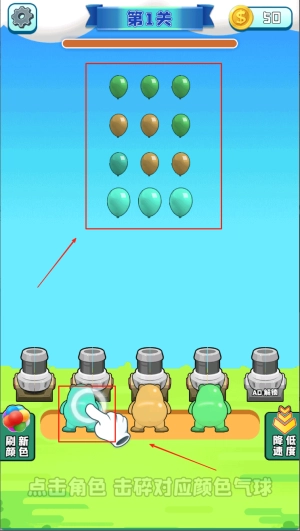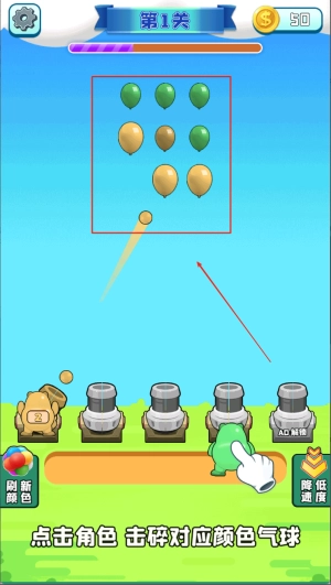 2. 轻点角色,让其抵达炮台发射位置。在此状态下,仅能对同色的目标气球发起攻击,同时强化色彩识别与目标锁定机制。