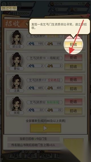 2、进行“门生招收”操作!点击“招收”按钮进入相应界面,筛选出资质大于等于80的门生,执行2次确认招收动作,注意不要选错资质低的门生,最终完成招收5名优质门生的任务。