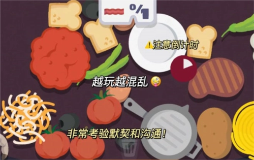 3、随着游戏进程推进,菜品会不断增多,你的桌面会变得杂乱无章,要找到特定菜品的难度也会持续上升。不过,只要队友间配合默契,依旧能迅速通关。