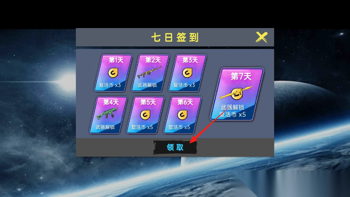 1. 每天登录并完成七日签到,点击领取相应天数的奖励,积攒复活币与武器。