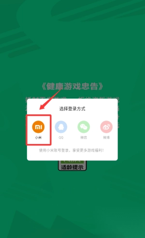 1. 请选择以小米账号作为登录方式,点击红框所标注的MI图标,即可进入。