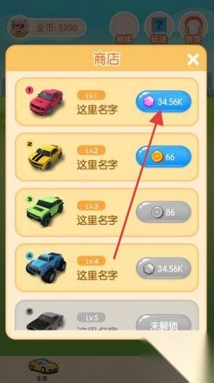 2、进入商店,用钻石(如34.56K)等货币,购买、升级不同等级汽车,提升车辆属性。