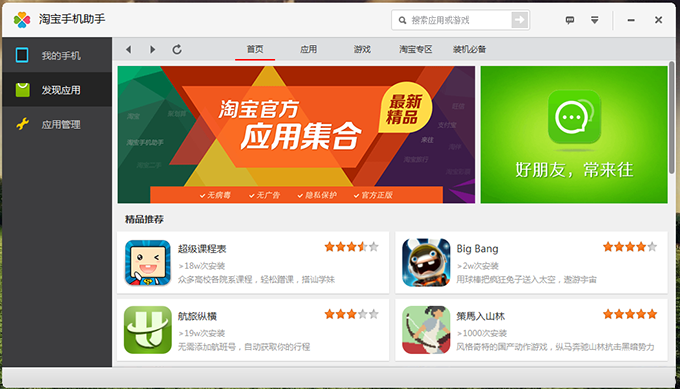 淘宝手机助手可以给用户提供游戏、软件、音乐、小说、视频、图片,通过淘宝手机助手可以轻松下载、安装、管理手机资源,有效连接了淘宝PC端和客户端,实现资源合理配置。淘宝手机助手还具有具有手机支付便捷安全、手机应用管理下载、清理手机等功能,还能轻松赚钱省钱,每天开心集分宝!