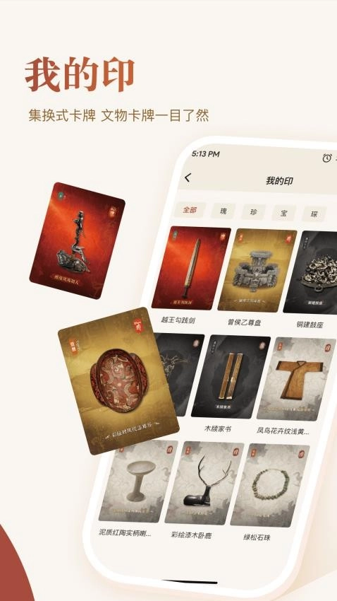 把用户点亮的全部文物印章都收藏起来,就能查看目前所拥有的各类文物卡牌。