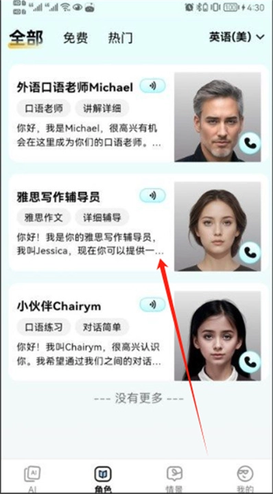 2、当你点击页面上的“AI”按钮,系统就会推荐多位AI口语老师。这些AI老师不仅拥有标准发音,而且在用户表达时能够即时作出回应,对语法、发音以及语义进行智能修正。