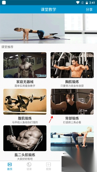1、打开健身教学软件app,映入眼帘的是众多教学模块,从中挑选一个。
