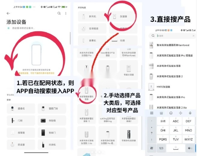 3. 不少设备通电后便会进入配网状态,支持自动配网。要是需要手动配网,能在该页面找到相应品类,进入二级界面后寻找对应的产品,或者直接搜索关键词来找到产品。