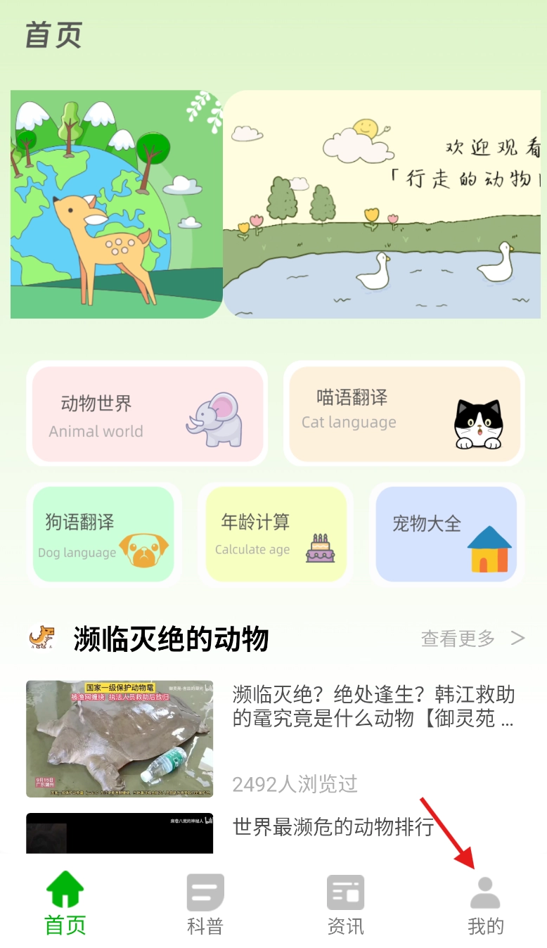 1、启动动物世界大全,在主界面底部找到并轻点 “我的” 选项。