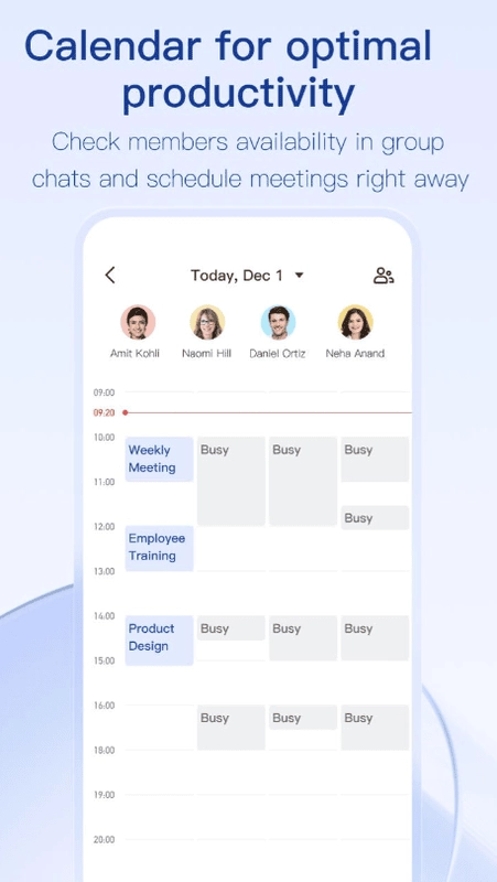 - 使用我们的日历随时掌握您的日程安排。通过任何会议邀请,您可以创建群聊、发起视频通话或创建会议备忘录