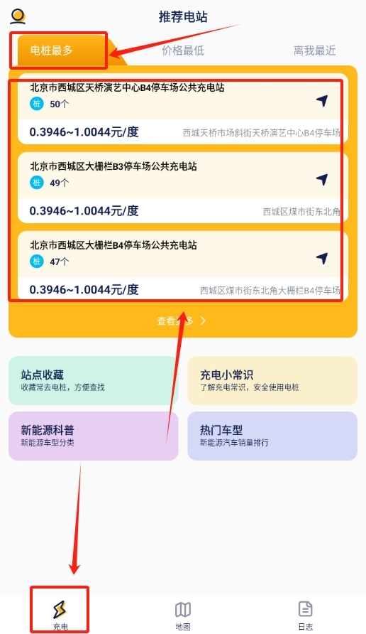 2、进入充电页面,找到筛选功能,选 “电桩最多”,就能看到附近充电站。
