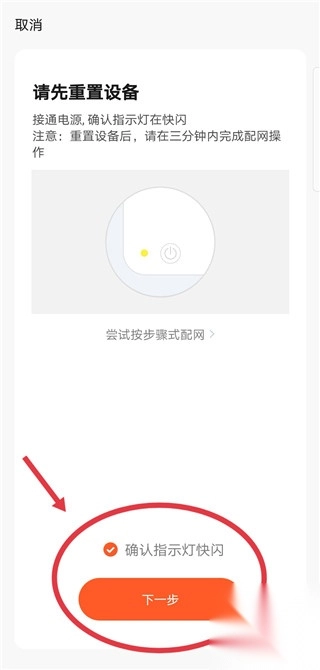 3. 当确认指示灯处于快速闪烁状态时,点击下一步。
