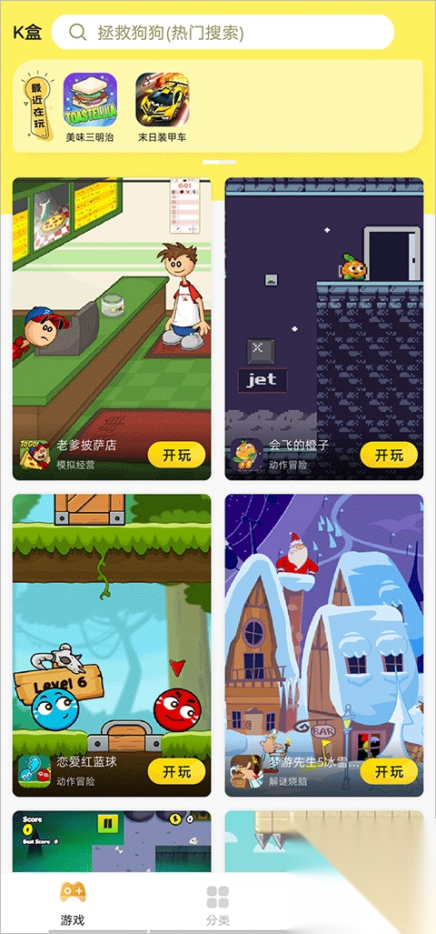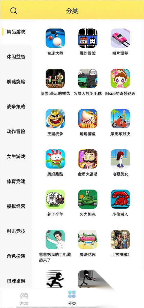 2、在分类界面有着超多类型的游戏,你想玩的这里都有!你还可以直接搜索你想玩的游戏。