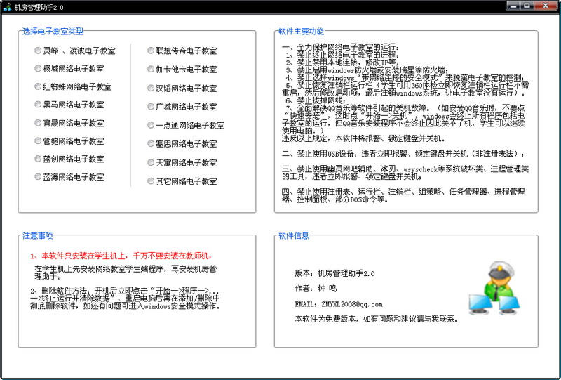 7、防止学生利用QQ音乐等软件的关机故障来终止电子教室的运行(安装QQ音乐时,到“快速安装”时不要点击,这时点“开始—>关机”,windows会终止所有程序包括电子教室的运行,但QQ音乐安装程序不会终止因此关不了机,学生可以继续使用电脑。)违反以上规定,本软件将报警、锁定键盘并关机。