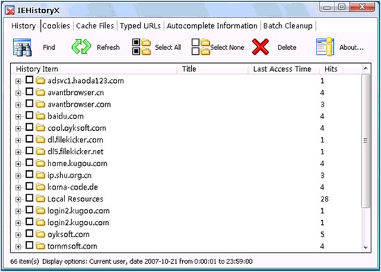 IEHistoryX V2.2.4.52 绿色特别版 一个可以搜索,查看,以及有选择性的删除ie历史记录,cookie文件,ie缓存文件,url记录以及自动输入的信息(如搜索历史,保存的密码)的简单易用的工具。