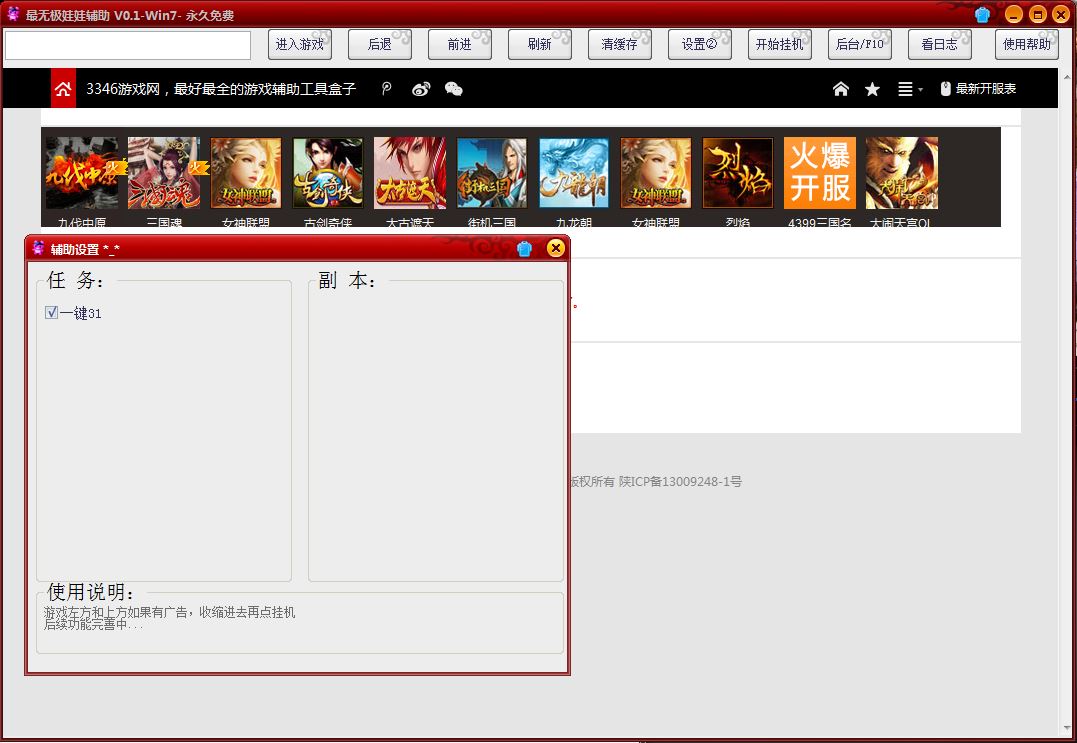 最无极辅助是一款为同名游戏制作的网页插件。最无极精灵辅助有自动喊话、一键31级、远古封神、自动签到、领取在线奖励、刷副本、刷材料、经营城池等等超多功能。是您游戏的好帮手。