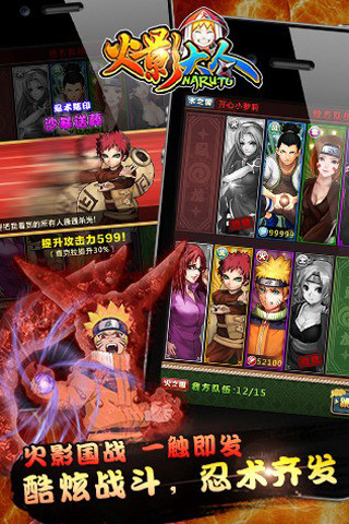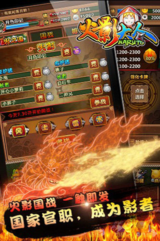 《火影大人》是一款以著名动漫《火影忍者》为故事背景的手机卡牌策略游戏,游戏中引入多种忍者角色,并在玩法上进行了重大创新,游戏中不仅有历练升级、闯关夺宝、竞技挑战等常规玩法,更是首创独具特色的国战系统。玩家在进入游戏之初便要选择火、水、雷、风、土任一国家,每晚19:30全服开启国战,各国精英齐聚一堂抗击敌人,体会万人国战千人斩的爽快感觉!每场国战力挽狂澜的英雄将受万众敬仰,圆玩家英雄梦想!每位志存高远的玩家也可以通过实力竞争国家官员乃至影者(国王),走向至尊!【更新日志】