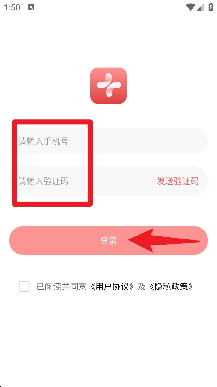 1. 开启健拓医疗App,在相应位置输入手机号及验证码,勾选同意相关协议,接着点击“登录”,即可进入主页。