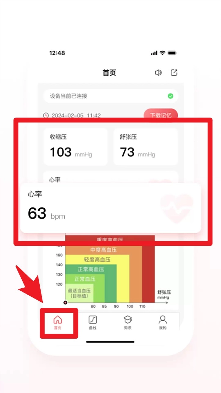 2. 进入首页,即可查看血压、心率等实时健康数据。完成测量后,图表会同步展示。