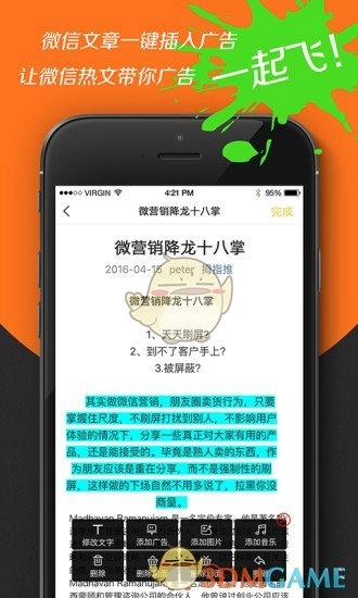 2、任意编辑文章 你可以在原文章中任意删减,插入文字、图片和视频、个人功能名片、动画效果,制作带有你的广告的好文章
