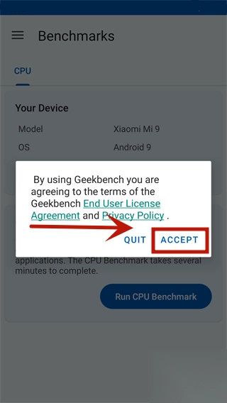1、在应用商店下载并安装 Geekbench 6 应用程序,初次进入软件需要点击 Accept