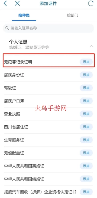 点击“添加证照”,在“个人证照”菜单栏下拉选项中选择“无犯罪记录证明”点击“添加”。(也可以根据名称或按部门查找)