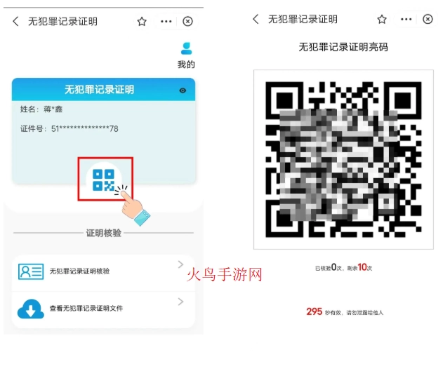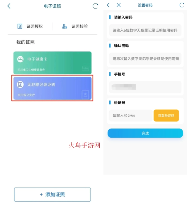 完成添加操作后,返回电子证照页面,这时“无犯罪记录证明”已成功添加。选中此证明,即可进入密码设置页面。按照提示,依次输入设置的亮证密码以及手机验证码。