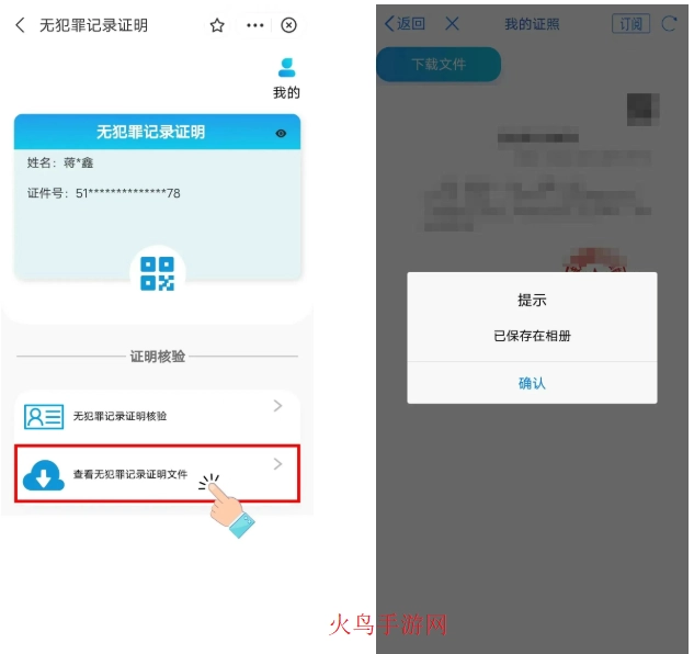 如需纸质版,点击“查看无犯罪记录证明文件”,点击“下载文件”或者“长按界面”即可下载图片,自行进行打印。