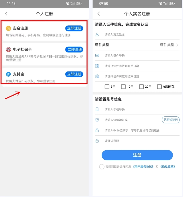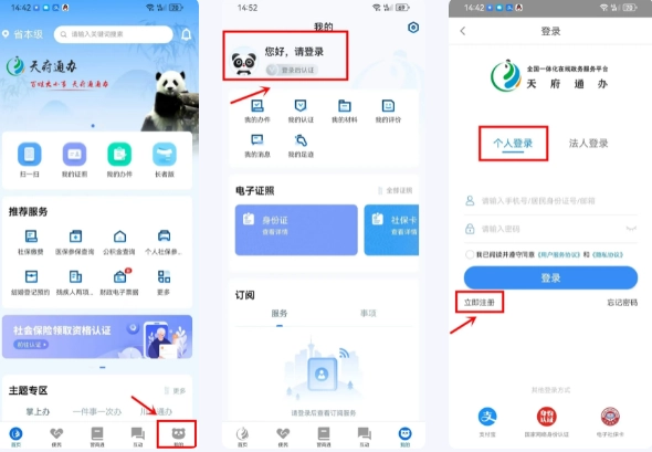 第二步:当前我们设有实名注册、电子社保卡、支付宝这3种注册途径。现以【实名注册】来讲,点击实名注册右上方的【立即注册】。依据页面给出的提示,填写相应信息并进行操作,从而完成个人实名注册。一旦注册成功,您便能借助“天府通办”APP办理各类事务啦!