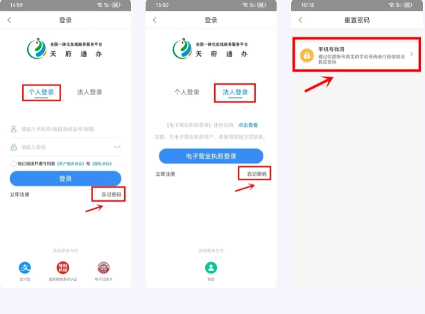 如需找回密码,可点击登录页面的【忘记密码】按钮,选择“手机号找回”选项,通过原账号绑定的手机号码接收短信验证码,完成验证后即可找回密码。此方法个人和法人用户均适用。