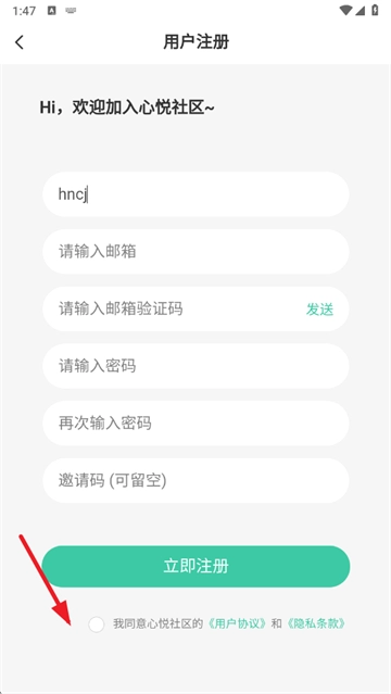 3、仅需一次输入用户名、邮箱、完成邮箱验证并设置密码,操作时别忘记勾选用户协议与隐私政策。
