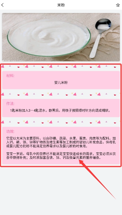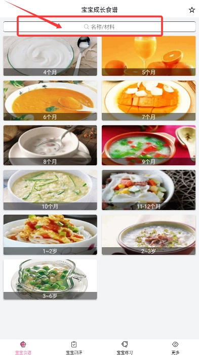1、首次使用时,在"营养食谱"界面可通过关键词快速检索辅食配方。