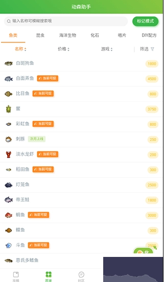2. 点击底部的图鉴按钮,即可查阅鱼虫、化石、家具配方等详细资料。