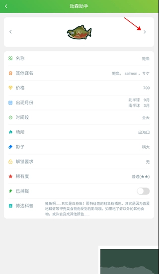 3、任选一条鱼查看,不仅有名字、稀有度,连出没时间也都标注得十分清晰。