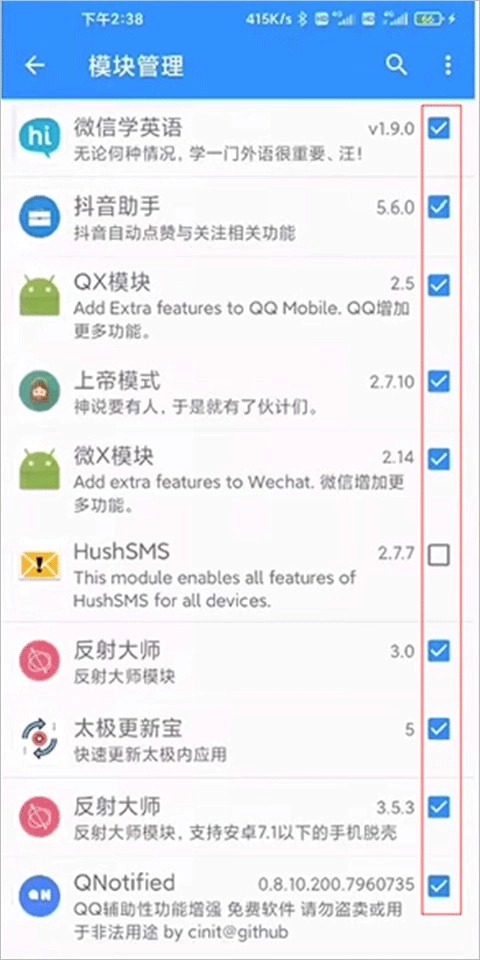 在模块管理界面打开后,便能查看到已安装的模块。当勾选某个模块时,系统会提示该模块所支持的应用版本。此外,应用版本在太极主界面同样能够查看。需要注意的是,若版本不兼容,模块将无法使用。