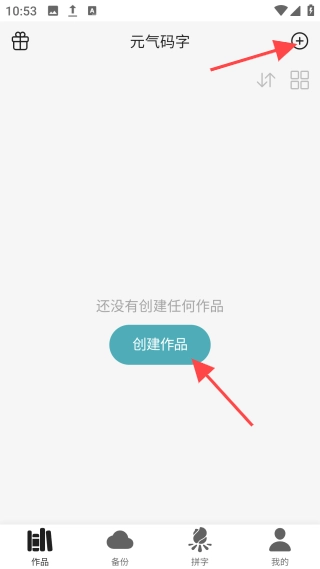 2、进入【作品】界面,点击右上角【+】图标或【创建作品】图标。