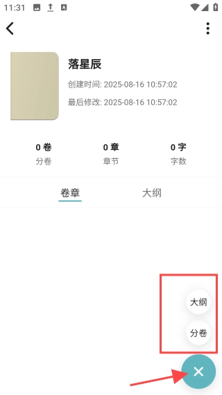 4、点击右下角【+】按钮,新建“大纲”和“分卷”,输入名称,开始创作。