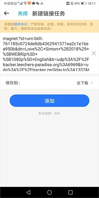 3、接下来输入链接地址,支持直链下载、磁力链接(即BT文件链接的新下载形式)以及电驴链接(一种比BT更早出现的下载方式)。例如,下图中输入的就是一条磁力链接。