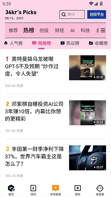 3在36氪app中,不仅涵盖新闻资讯内容,更有海量视频资源。这些视频,部分源自自媒体,部分出自官方新闻媒体。此外,该app设有快讯板块,能为用户带来分钟级的新闻资讯动态,助力用户迅速知晓全球各类财经新闻。