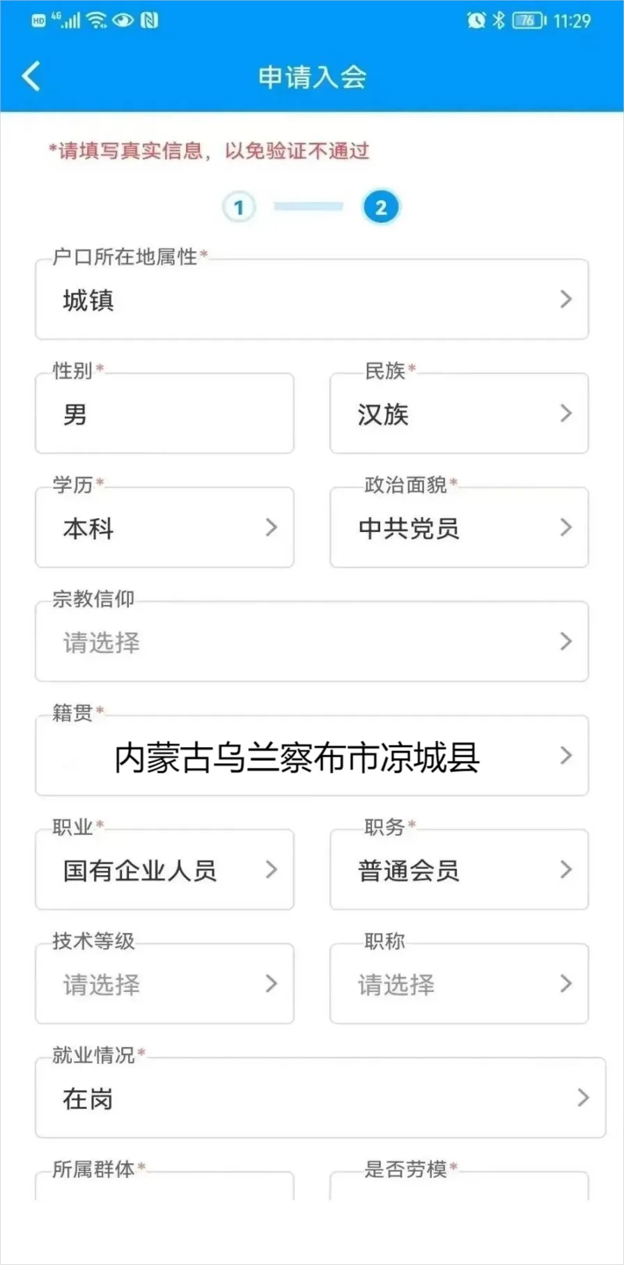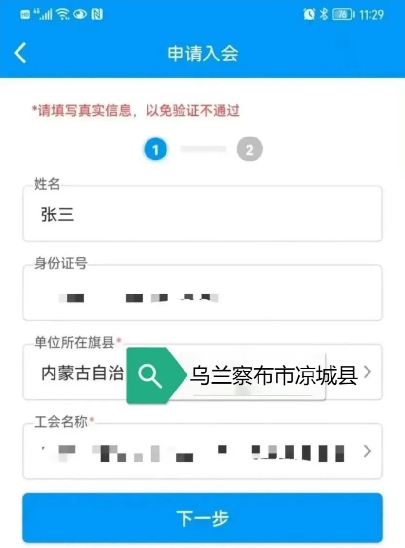 5、请填写姓名及身份证号,接着选择单位所处的旗县,随后通过关键词搜索所在单位工会的名称(图示为示例)