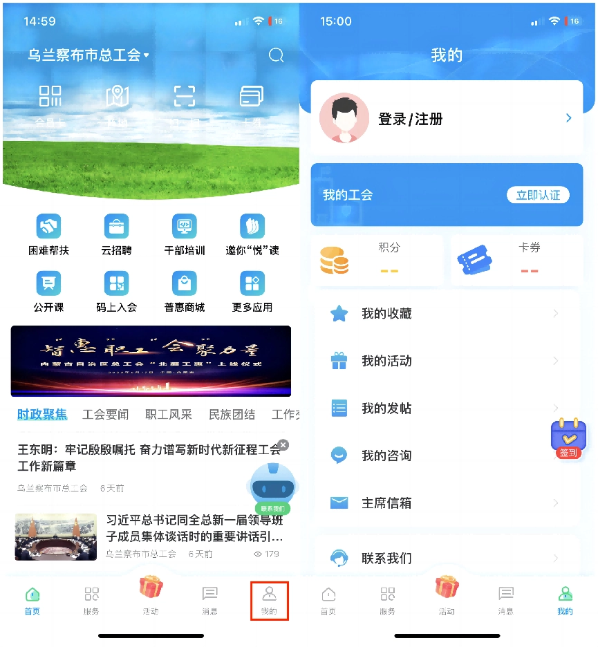 1. 在本站点击下载“北疆工惠”APP,下载结束后,点击“我的”,接着点击“登录注册”。
